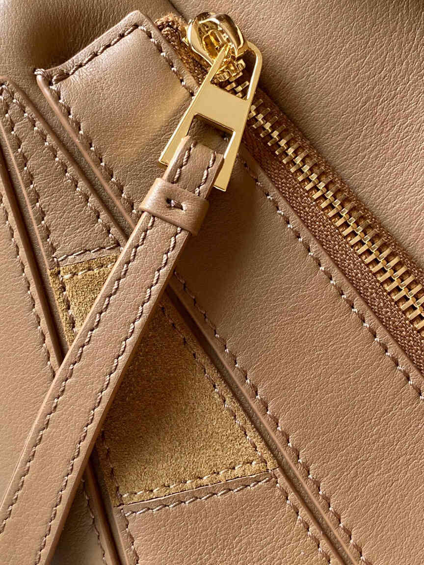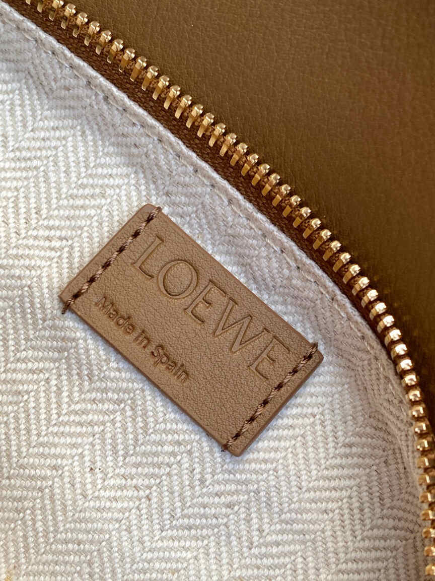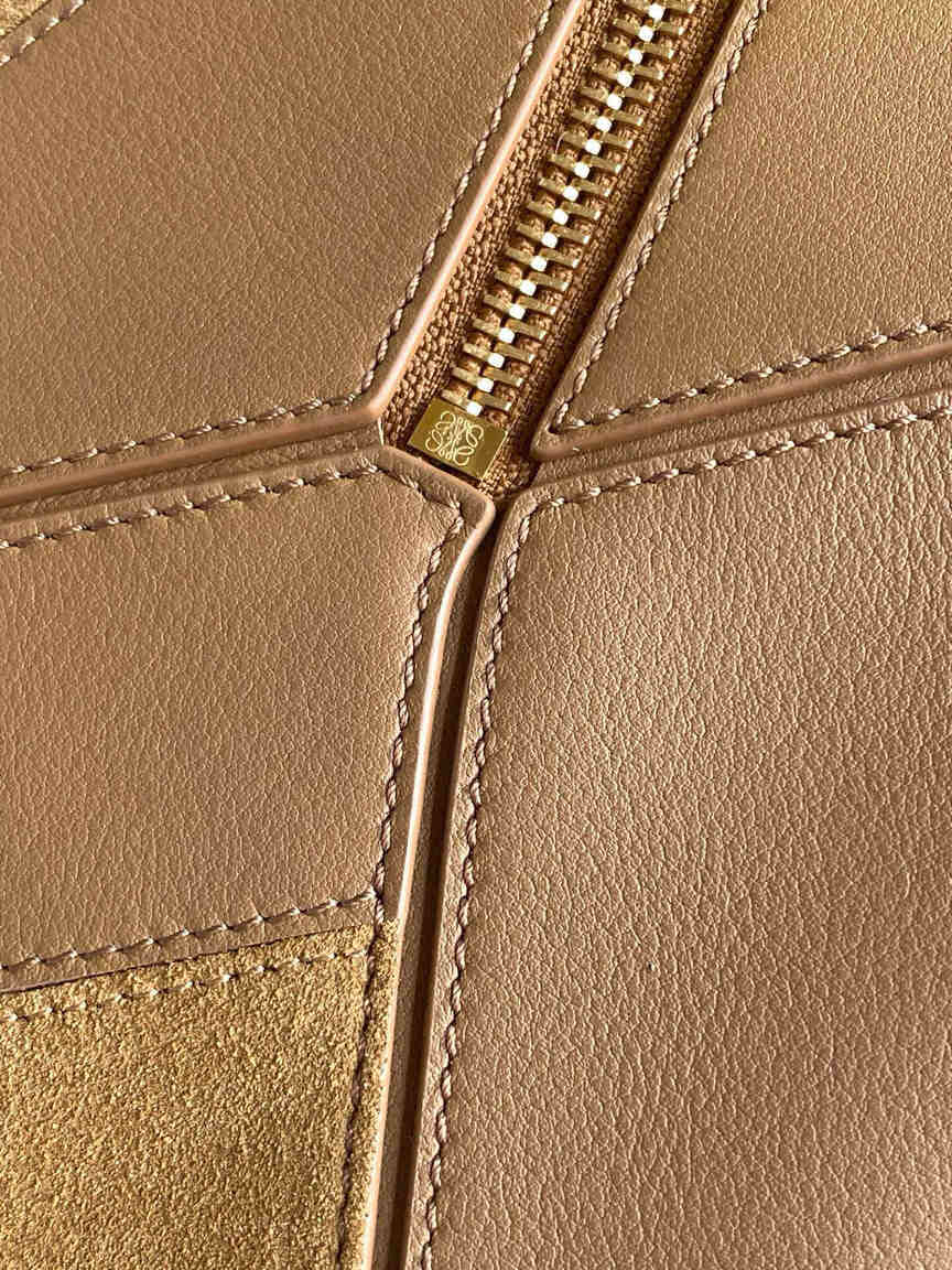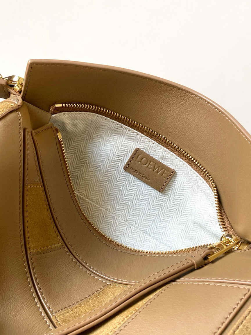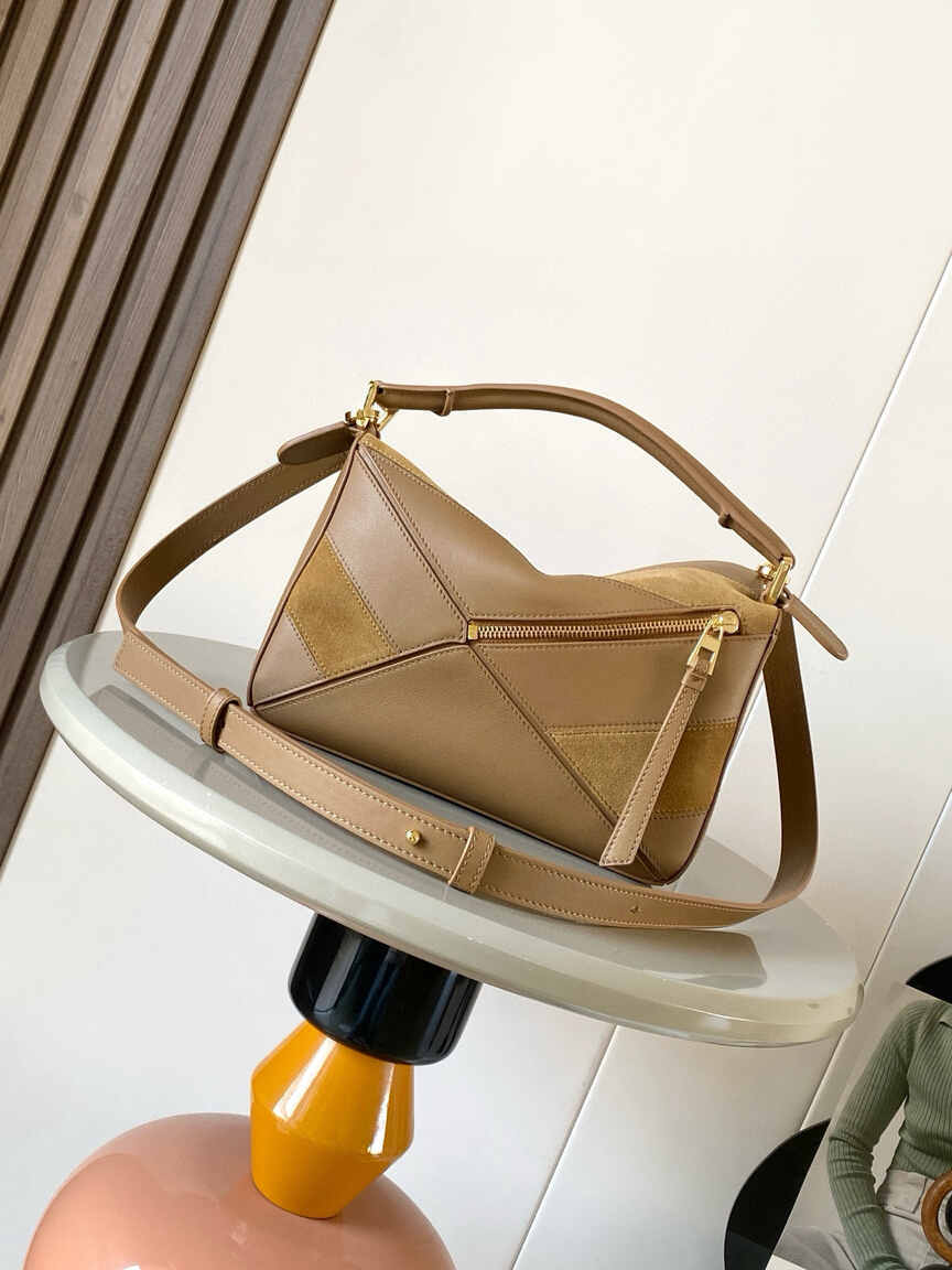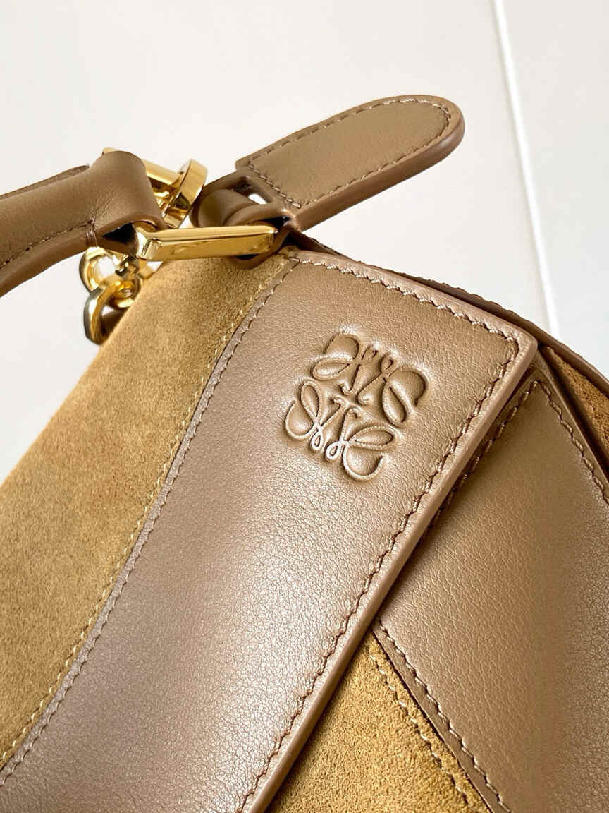 This small version of the Loewe Puzzle bag showcases the house’s signature cuboid shape, defined by distinctive geometric lines. Crafted from a premium blend of smooth oak-brown calfskin and tactile suede, it features intarsia stripes that add a contemporary edge to the timeless design. The bag is highly versatile, with a detachable and adjustable shoulder strap for shoulder or crossbody carry, plus a sturdy top handle for hand-carry. Key features include a secure zip closure with a leather puller, an external rear zip pocket for easy access, and a luxurious suede lining with an internal slip pocket. The iconic Anagram logo is elegantly embossed on the flap.